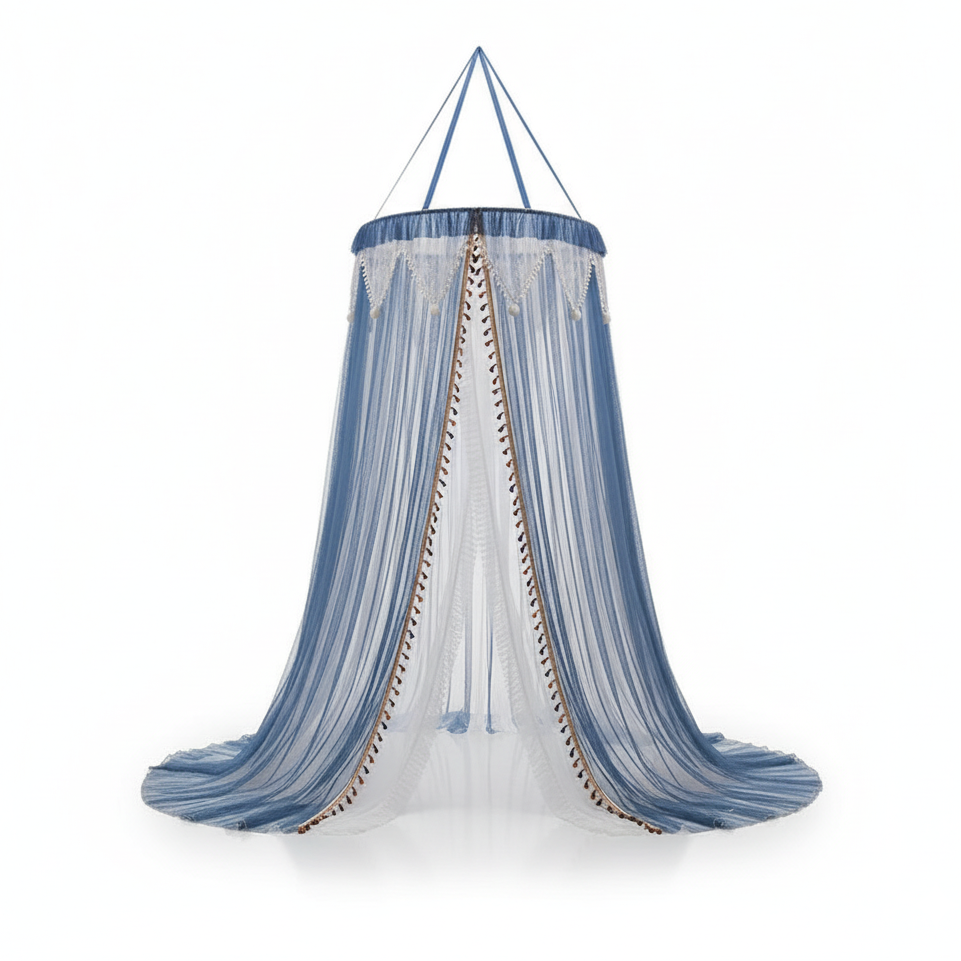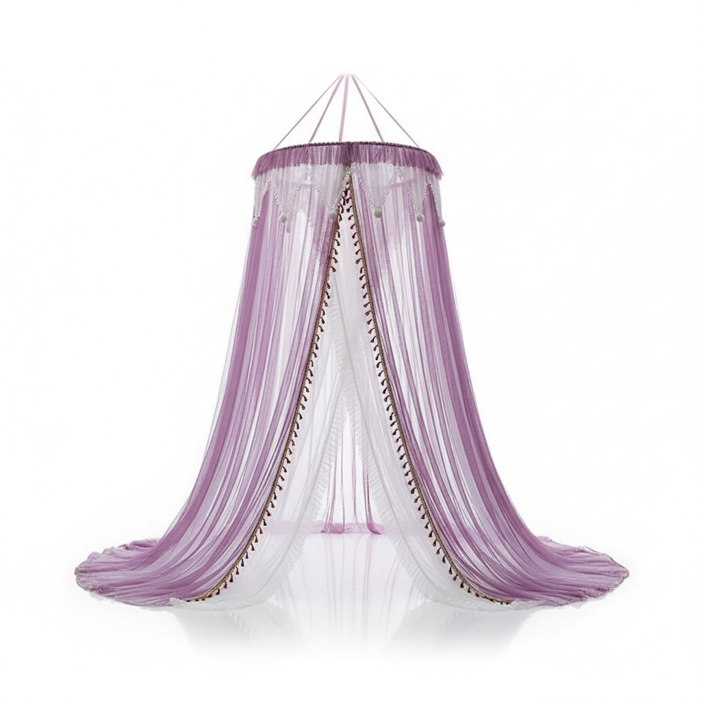 La dentelle fine qui orne son pourtour ajoute une touche de raffinement discret, tandis que sa forme en dôme rappelle les chambres princières d’autrefois.