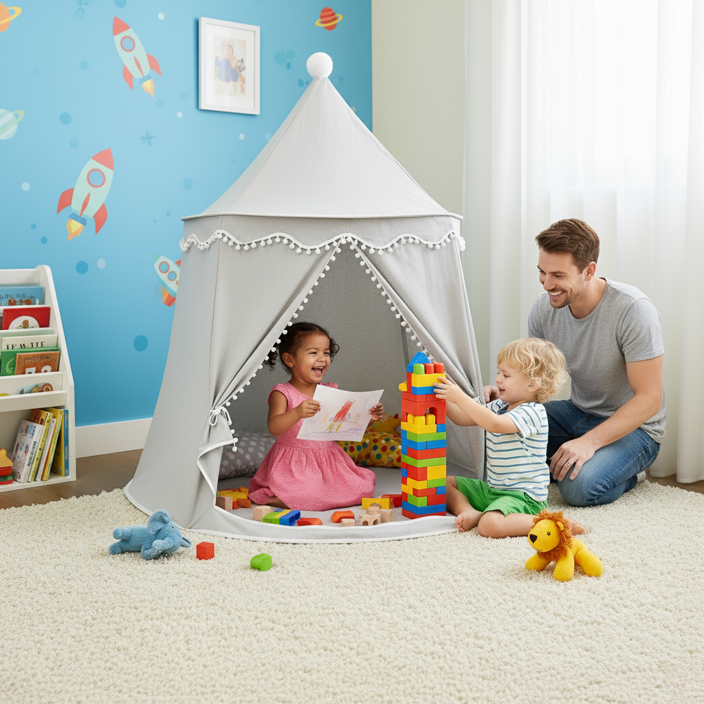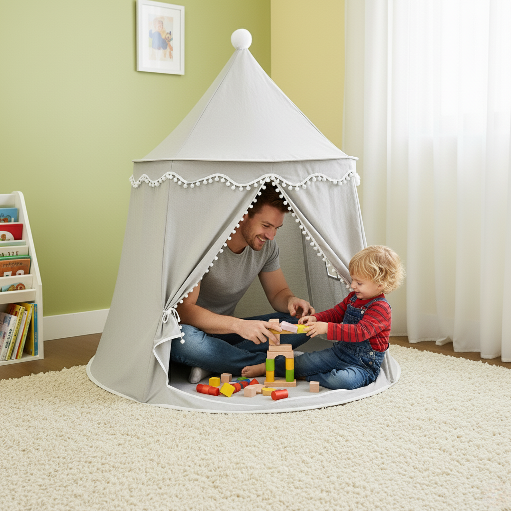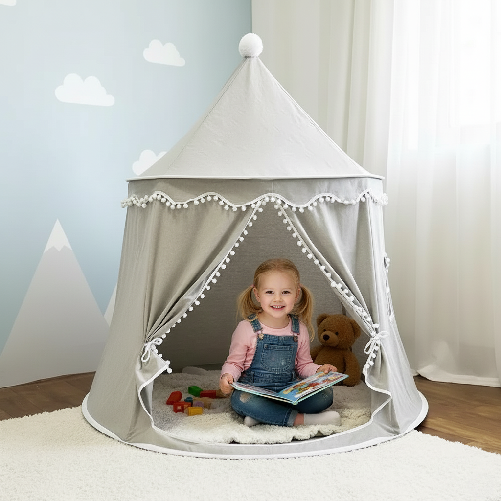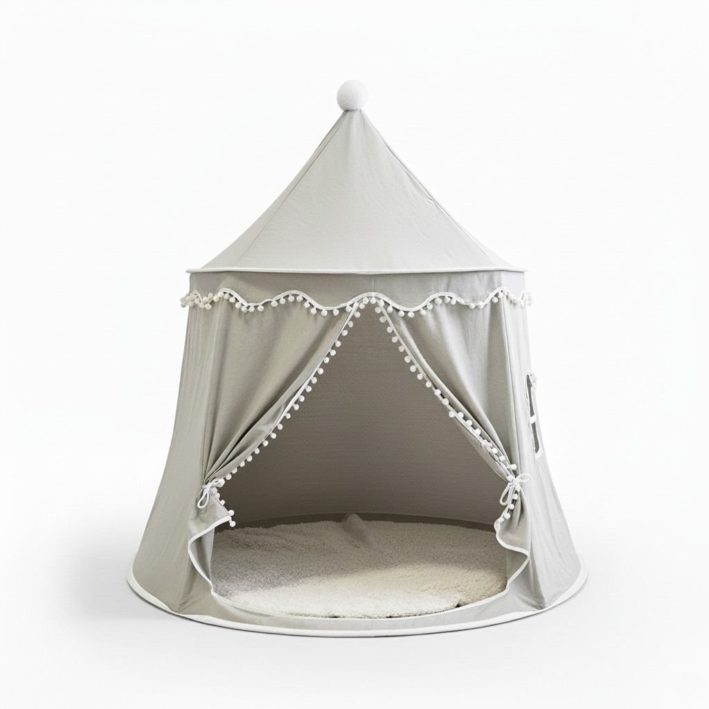 Conçue dans un tissu gris neutre et élégant, elle s'intègre harmonieusement à la décoration de n'importe quelle chambre ou salle de jeux. Le design est rehaussé d'une bordure de pompons blancs délicats et d'un pompon au sommet, qui lui confèrent un charme à la fois classique et ludique.